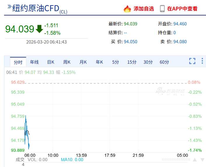 国际油价下挫。截至发稿,纽约原油跌1.58%,报94.03美元/桶。此前,19日收盘,纽约原油跌0.19%收于每桶96.14美元;布伦特原油涨1.18%,收于每桶108.65美元。